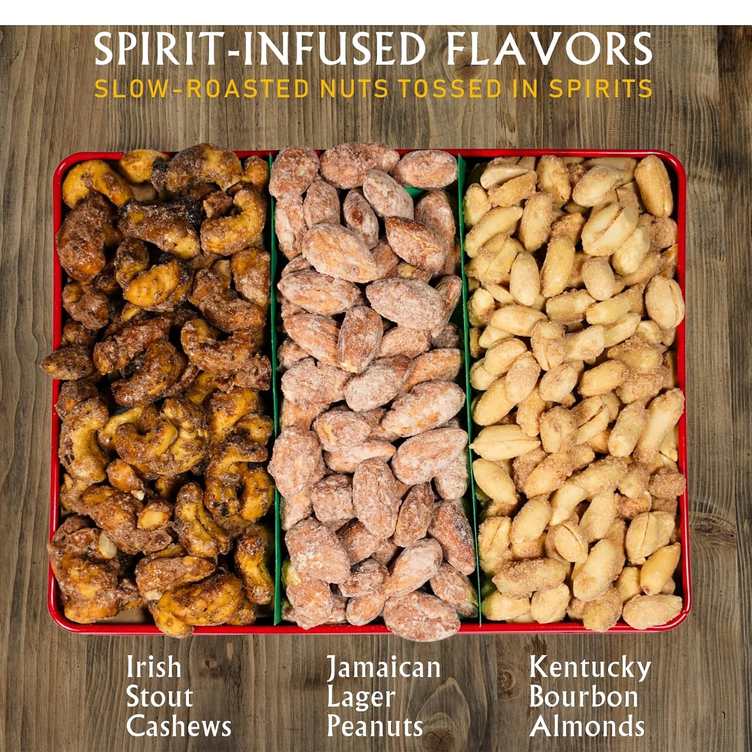 ASTONISHING FLAVORS – Unique flavor combinations offer a savory, spirited, crunchy flavor variety; Liquor nuts Include: Irish Stout Cashews, Jamaican Lager Peanuts, and Kentucky Bourbon Almonds