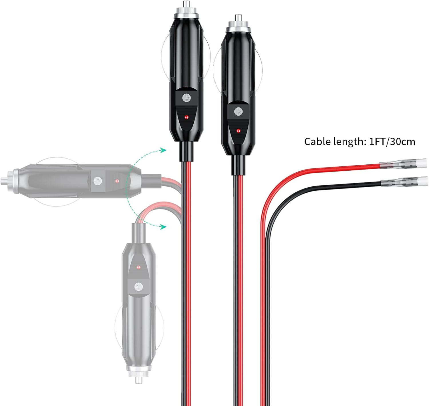 Cigarette Lighter Plug: This is a standard cigarette lighter plug, Wire Length: 30cm, 16AWG Gauge, Current: 10A, Applicable Voltage: DC12V/24V