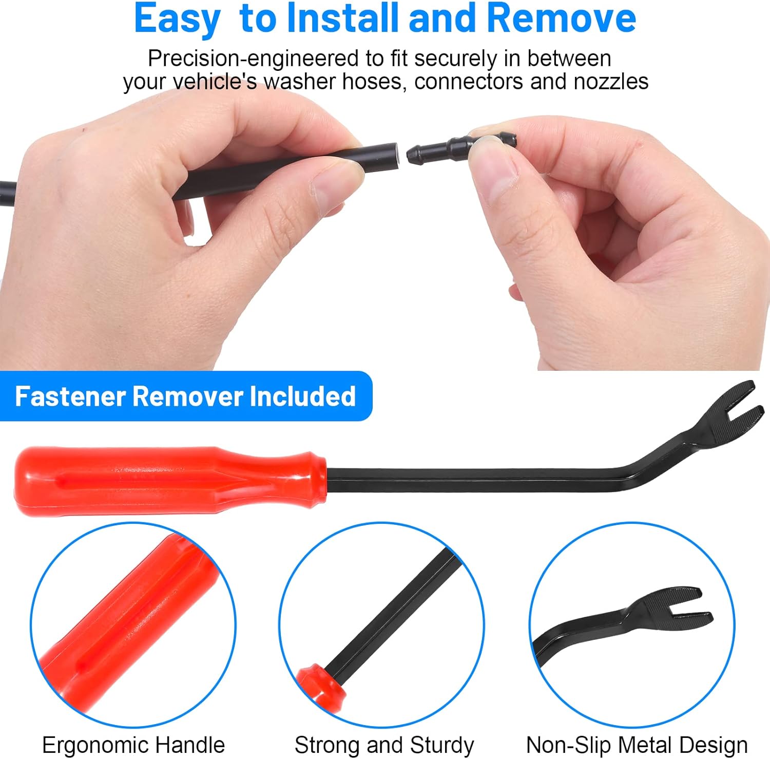 【Easy to Install & Remove】Our washer nozzle and hose replacement are precision-engineered, easy to install, and can fit securely on wash pumps, connectors, and washer nozzles. The tough fastener remover with lightweight and ergonomic design makes car repair easier and will not scratch or damage your car, great for automotive exterior & interior trim removal and furniture restoration, even for bicycle tire removal.