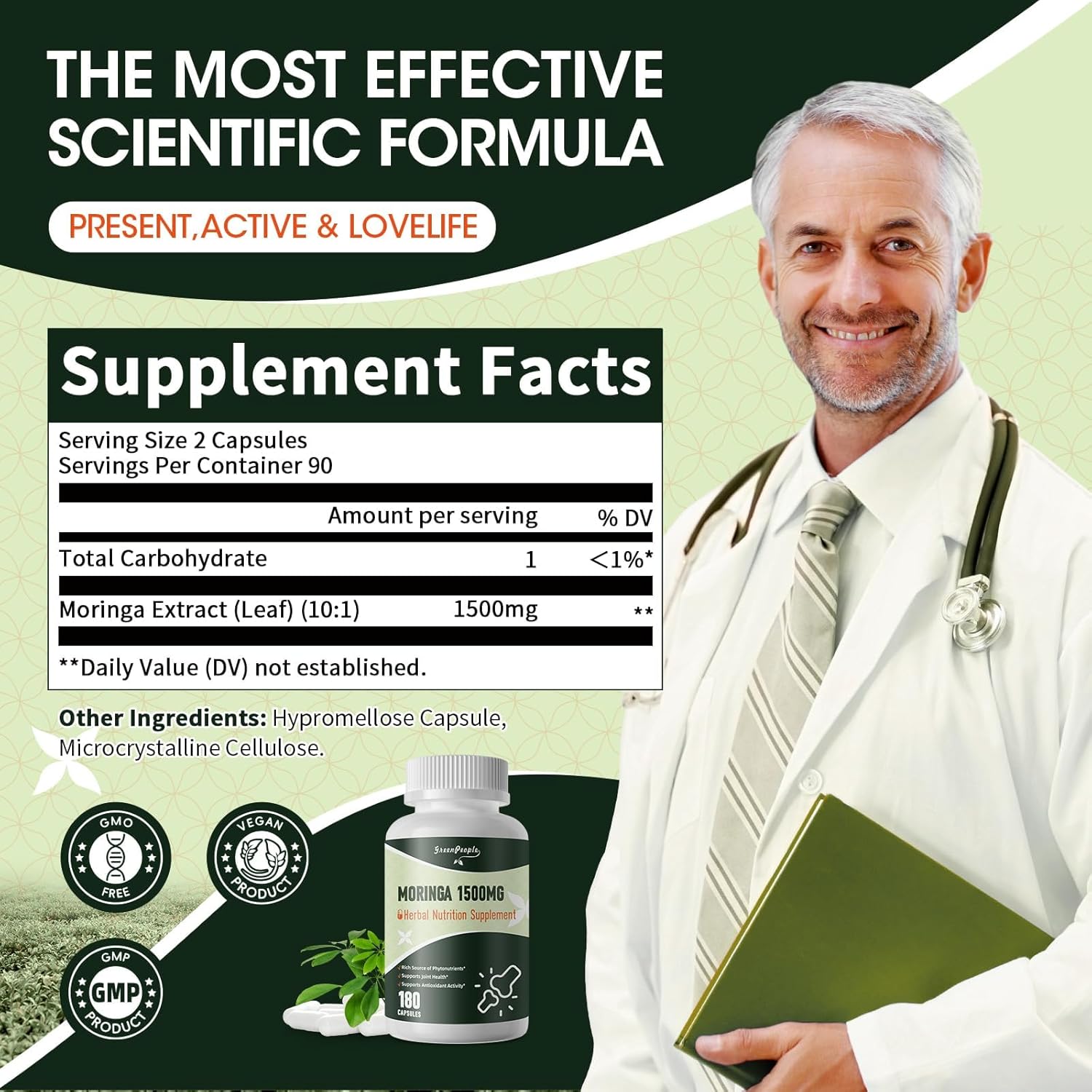 Efficient formula: GREENTOPLE Moringa Capsules contain 1500mg Moringa extract, which is rich in vitamins, minerals, and antioxidants. It can effectively enhance immune system function, improve digestive system function, promote detoxification, and improve body resistance.