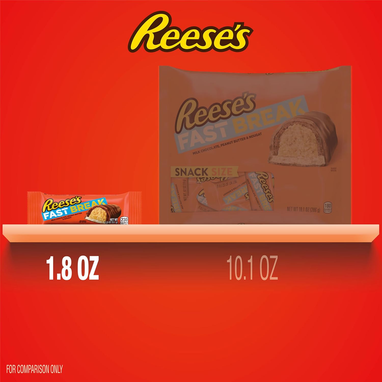 Contains eighteen (18) 1.8-ounce REESE’S FAST BREAK Milk Chocolate, Peanut Butter and Nougat Candy Bars in a bulk box