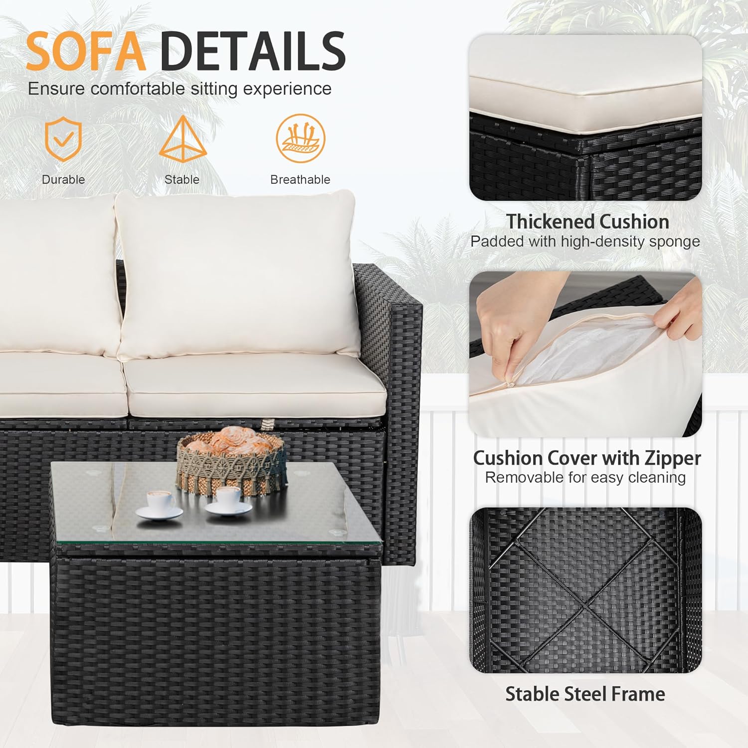 Easy Clean: The zippered cushion covers of the wicker conversation sofa are detachable and washable, and the PE rattan surface is smooth, which offers convenience for you to clean.