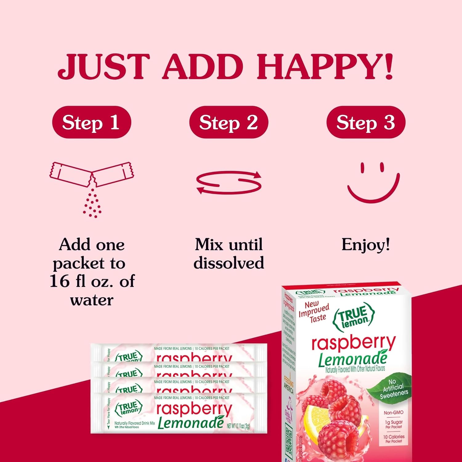 Stay Happily Hydrated! True Lemon Raspberry Lemonade Drink Mix makes it easy to add the refreshing taste of delicious raspberry lemonade to your water, so you drink more water throughout your day. Just add one packet to 16 ounces of water