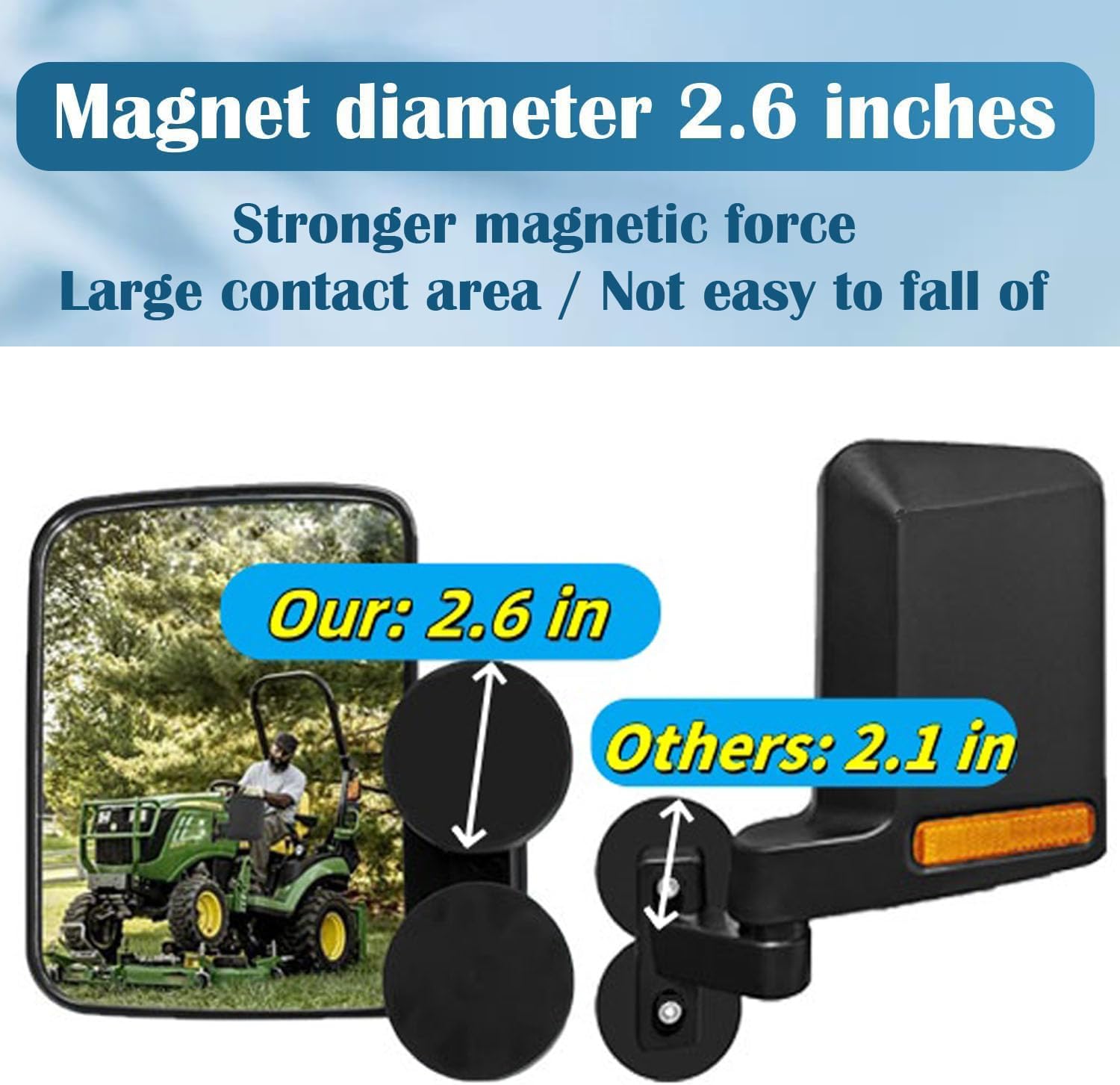 Strong Magnetic: Each magnetic tractor mirrors comes with 2 x 2.6in magnetic attachments, these powerful magnets ensure that the mirror remains in place even during bumpy rides or rough terrains